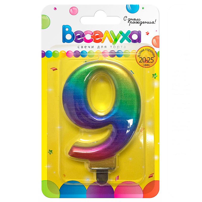 Свеча для торта Цифра Радуга металлик "9" 9см