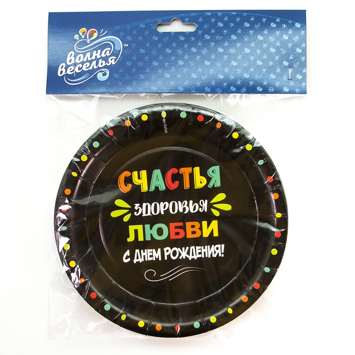 Тарелки бумага 180мм С Днем Рождения Любви и Счастья Черный уп6