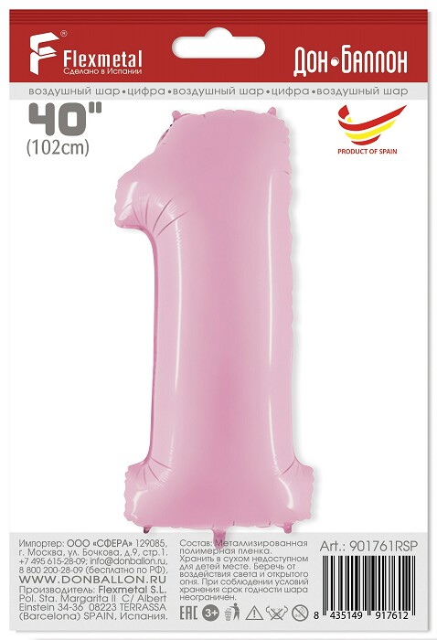 Шар фольга Цифра 40''/Fm Розовая Pink "1"