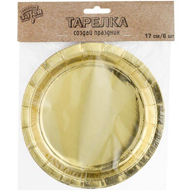 Ламинированные блестящие тарелки золотого цвета. Универсальны, подходят для любого праздничного фуршета и торжества. Выглядят стильно, нарядно и ярко. В наборе 6 бумажных тарелок размером 17 см.