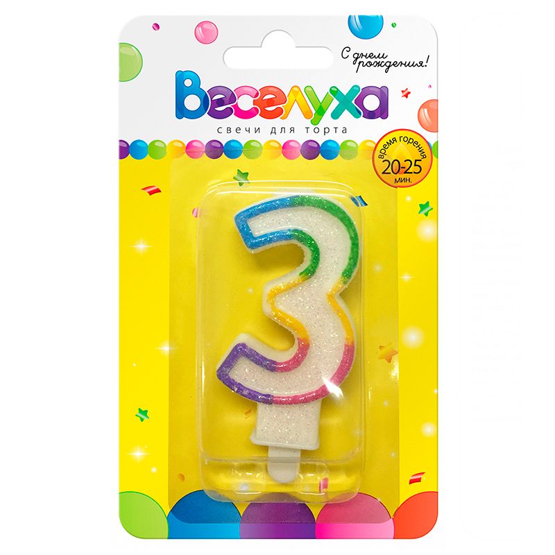 Свеча для торта Цифра Разноцветный градиент с глиттером "3" 6см