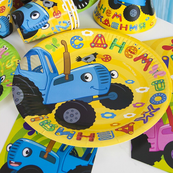 Используя в оформлении товары лицензионной коллекции «Синий трактор», Вы сможете оформить праздник в тематическом стиле любимого мультфильма и его героев.