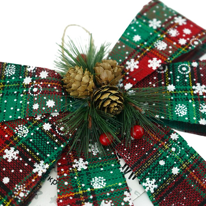Бант красно-зелёный с декором из шишек может быть использован для декорирования подарков или украшения интерьера.