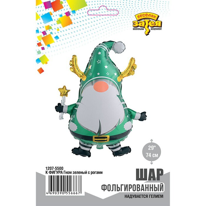 Большой объемный фольгированный шар высотой 74см в форме милого гнома. При надувании рекомендуется использовать гелий. Имеет встроенный клапан -что упрощает надувание. Поставляется в красочной упаковке с цветным изображением шара, благодаря чему можно выставлять товар в сдутом виде. Размер шара 60x74см. Тонкая миларовая (фольга на полиэтиленовой основе) пленка позволяет шарам не сдуваться до 5 дней.