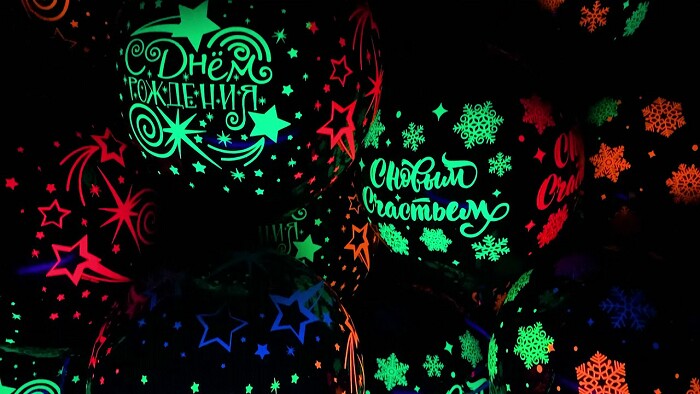 Флуоресцентные шары для волшебного украшения праздника. Благодаря флуоресцентным пигментам шарики не требуют дополнительной подсветки и светятся сами в ультрафиолетовом освещении. Оформление ночного интерьера светящимися шарами сделает праздничный вечер волшебным.