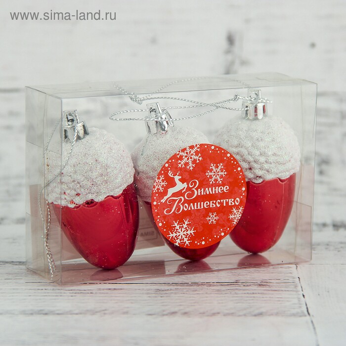 Игрушки на елку фигура Желудь со снежной шапочкой 5,5х4см красный (уп3)