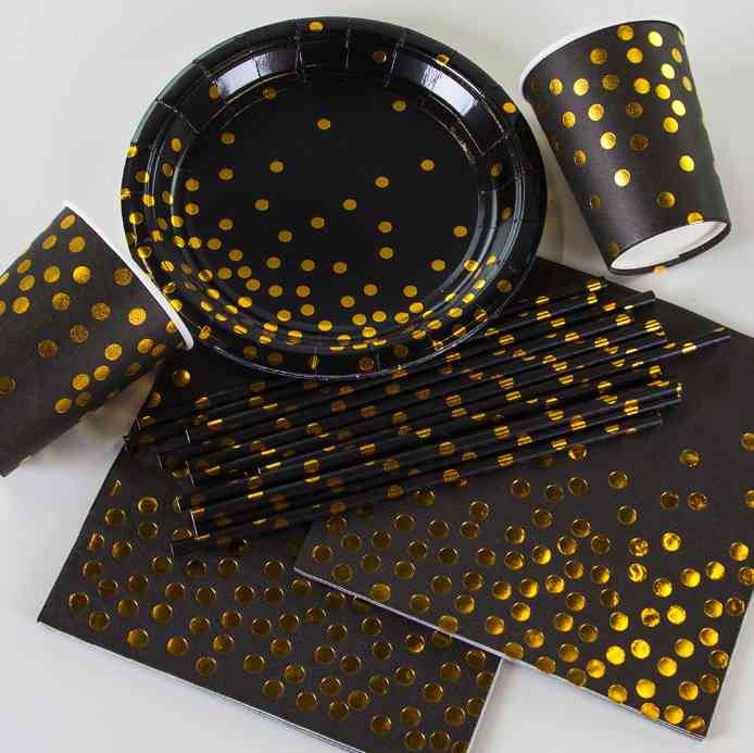 Мерцание и блеск фольгированных элементов на стильной одноразовой посуде станет дополнительным украшением торжества, а также поможет минимизировать время организации знаменательного события.