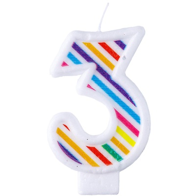 Белая свеча в форме цифры "3" с яркими разноцветными полосами. Отличное решение для декорирования торта, десерта ко дню рождения или юбилею. Высота свечи-цифры 7см.