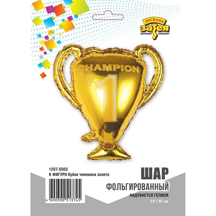 Большой объемный фольгированный шар в форме золотого кубка чемпиона. При надувании рекомендуется использовать гелий. Имеет встроенный клапан -что упрощает надувание. Поставляется в красочной упаковке с цветным изображением шара, благодаря чему можно выставлять товар в сдутом виде. Размер шара 61 см. Тонкая миларовая (фольга на полиэтиленовой основе) пленка позволяет шарам не сдуваться до 7 дней.