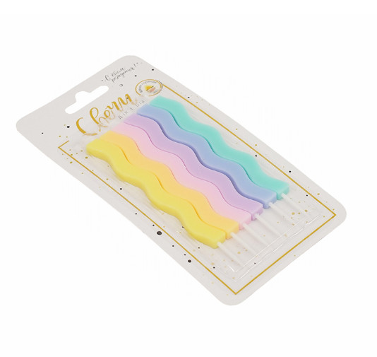 Каждая свеча выполнена в форме изящной волны, что придает ей особый шарм и элегантность. Пастельная палитра – розовый, лавандовый, мятный, голубой и другие – идеально подойдет для детских праздников, свадебных торжеств и юбилеев.