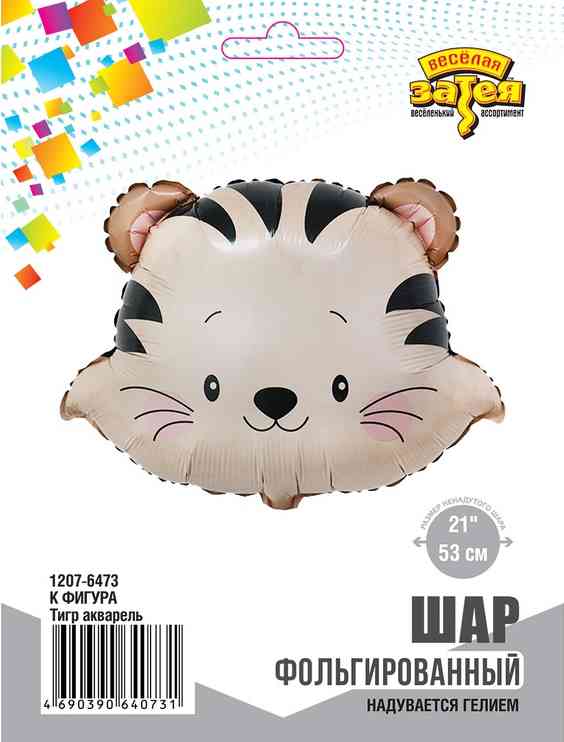 Фигурный фольгированный шар в виде очаровательного тигренка — это замечательный элемент декора для любого праздника! Такой шар добавит атмосферу уюта и радости, а его милый дизайн обязательно привлечет внимание гостей, особенно детей. Шар может надуваться как воздухом, так и гелием. Имеет встроенный клапан - что упрощает надувание. Размер шара в ненадутом виде 53(W)x50(H)см. Тонкая миларовая (фольга на полиэтиленовой основе) пленка позволяет шарам не сдуваться более 5 дней. Упакован в индивидуальную упаковку с красочным изображением шара, что позволяет выставлять товар в ненадутом виде. Идеи для использования шара: 1. День рождения: Этот шар станет отличным акцентом на празднике, особенно если он посвящен детскому дню рождения. Мишка в колпаке может стать центральным элементом фотозоны. 2. Праздничный декор: Используйте шар в качестве части общего декора вместе с другими шарами и гирляндами. Он отлично сочетается с яркими цветами и другими праздничными атрибутами. 3. Подарок: Такой шар