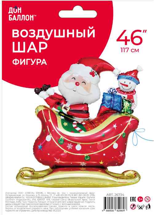 НГ Шар фольга фигура AIR Дед Мороз на санях с подарками 46" 117смFL (упак)