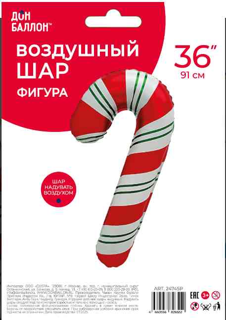 Шар 38"97 см, фольга Леденец-трость, красныйзелёный