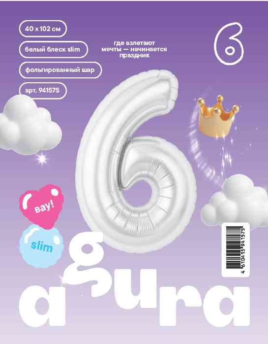 Шар фольга Цифра 40"AG Slim Белый блеск "6" (упак)
