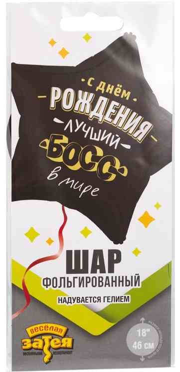 фольгированный шар размером 18"/ 46см в форме звезды с оригинальным дизайном - отличный способ поздравить лучшего босса с днем рождения. Шар изготовлен из качественных материалов (полимерная фольгированная пленка). Основной фон шара плотного, черного цвета с матовым эффектом,а некоторые элементы в дизайне - блестящего, металлизированного золотого оттенка. Шар имеет встроенный клапан, что упрощает надувание. Для надува рекомендуется использовать гелий. Поставляется в красочной упаковке с цветным изображением шара, благодаря чему можно выставлять товар в ненадутом виде. Внимание! Реальный цвет товара может незначительно отличаться от представленного на фотографии в зависимости от настроек вашего монитора.