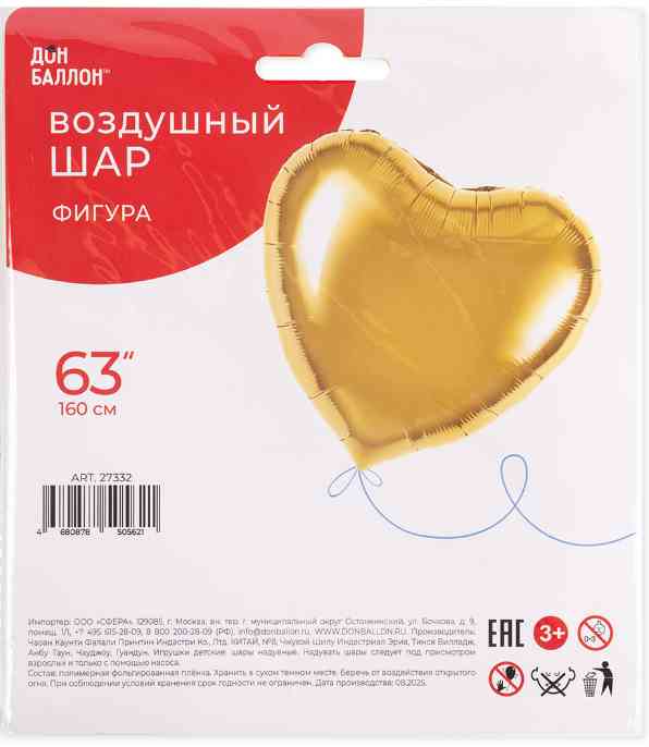 Шар фольга без рисунка 63"FL сердце Металлик Золото