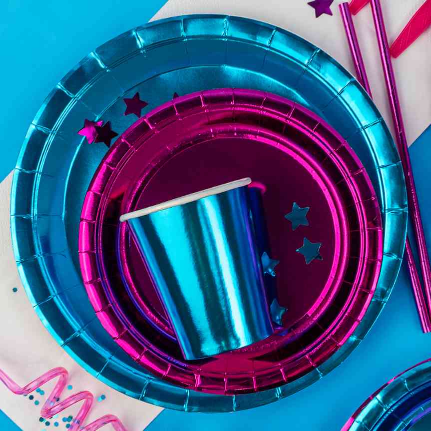 Мерцание и блеск фольгированных элементов на стильной одноразовой посуде станет дополнительным украшением торжества, а также поможет минимизировать время организации знаменательного события.