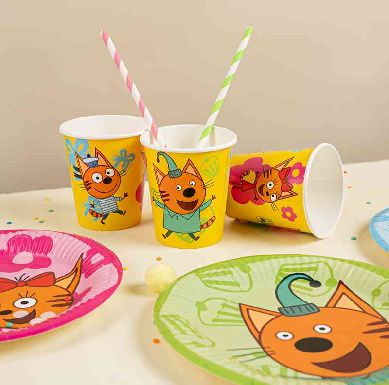 Красочная одноразовая посуда с любимыми персонажами мультфильма "Три Кота" станет дополнительным украшением праздника, а также поможет минимизировать время организации торжества.