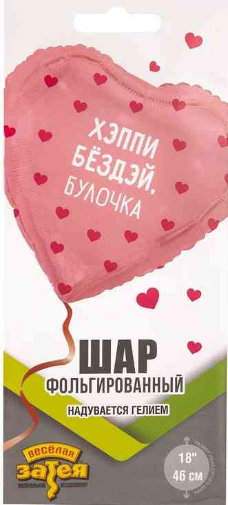 фольгированный шар размером 18"/ 46см в форме сердца с оригинальной надписью "ХЭППИ БЕЗДЭЙ БУЛОЧКА". Шар изготовлен из качественных материалов (полимерная фольгированная пленка). Шар имеет встроенный клапан, что упрощает надувание. Для надува рекомендуется использовать гелий. Поставляется в красочной упаковке с цветным изображением шара, благодаря чему можно выставлять товар в ненадутом виде. Внимание! Реальный цвет товара может незначительно отличаться от представленного на фотографии в зависимости от настроек вашего монитора.
