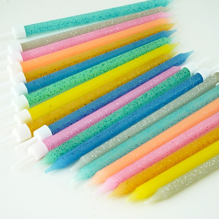 Набор свечей представлен яркими сверкающими свечами разных оттенков. Сверкающий эффект достигается за счет добавления глиттерных составляющих. Уникальный размер 15 см и эстетичный дизайн свечи лаконично дополнит самый стильный торт на день рождения.