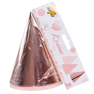 Карнавальный головной убор к коллекции по дизайну. Упаковка включает 3 вида колпаков по 2 штуки каждый: фольгированный в цвете розового золота и 2 бумажных в нежных оттенках розового.