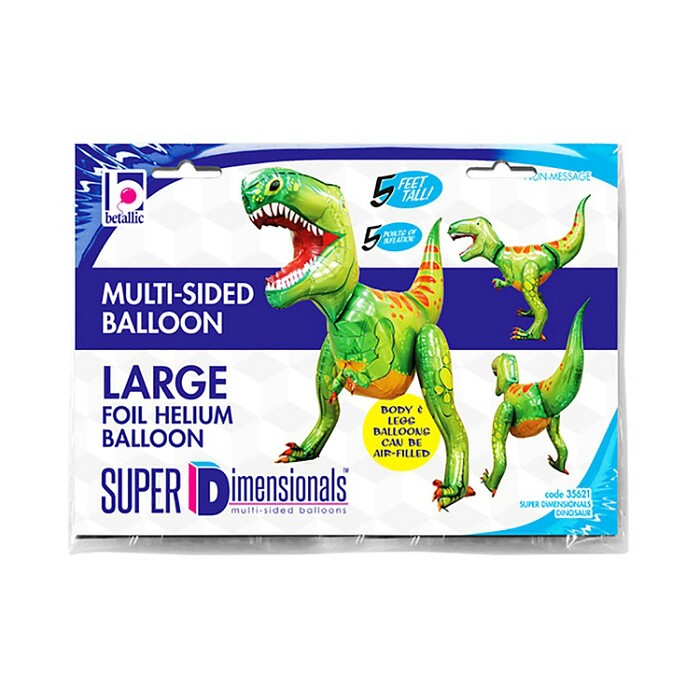 Объёмный крупный фольгированный шар в форме динозавтра. Шар продаётся ненадутым. Для надува тела и задних лап может быть использован воздух. Голову и хвост обязательно надувать гелием! Шар имеет 5 встроенных клапанов для надува. Тонкая миларовая (фольга на полиэтиленовой основе) пленка позволяет шарам не сдуваться от недели до одного месяца. Размер: 152 см. Производитель: Betallic, США.
