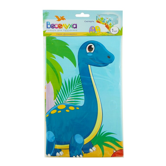 Праздничная скатерть «Динозаврики» дополнит оформление и добавит праздничных акцентов вечеринке.