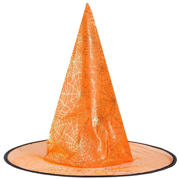 Оранжевый колпак с широкими полями и золотой паутиной идеально дополнит наряд ведьмы или колдуньи на Хэллоуин.
