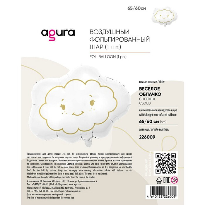 Шар фольга фигура Облачко веселое 26" 66см AG 226009