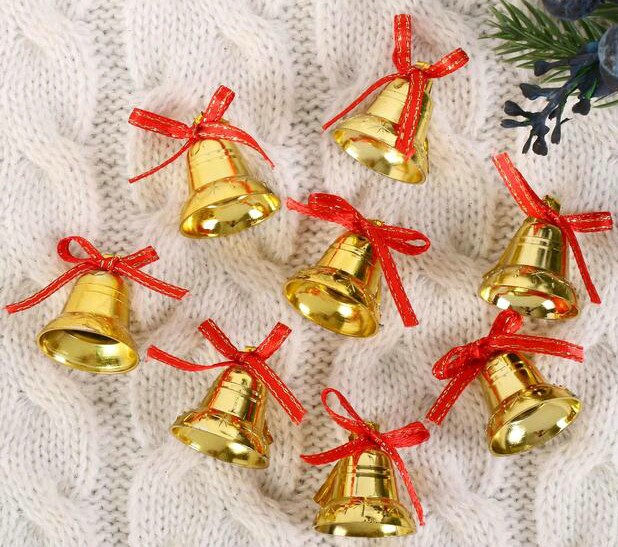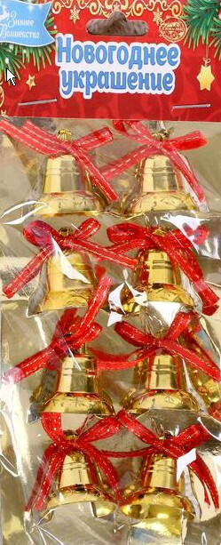 Игрушки на елку Колокольчики с бантиком и снежинками 2см золото (уп8)
