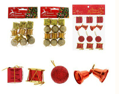 В наборе: подарок 3 шт., колокольчики 2 шт., шар 3 шт., барабан 3 шт.
