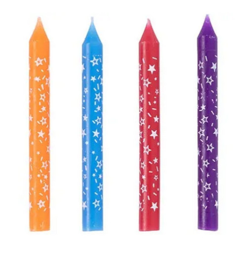 Декоративное украшение праздничного стола. Разноцветные свечи с рисунком "Звёзды" для декорирования торта, десерта ко Дню рождения, юбилею, Новому году. Стеарин, оригинальный дизайн. Высота свечей 8см, в упаковке 12 штук без подставок.