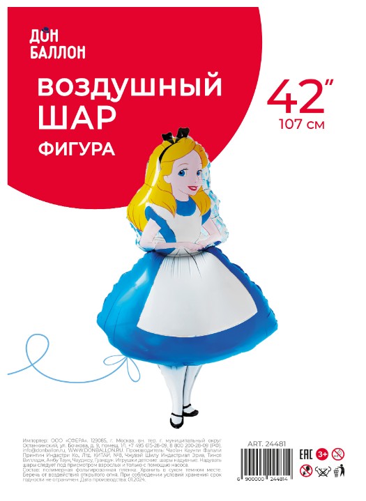 Шар фольга фигура Девочка Алиса 42" 107смFL