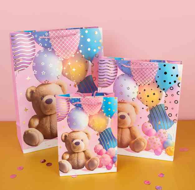 Пакет бумажный L 26х32см Мишка с шариками Дизайн №1 Металлик