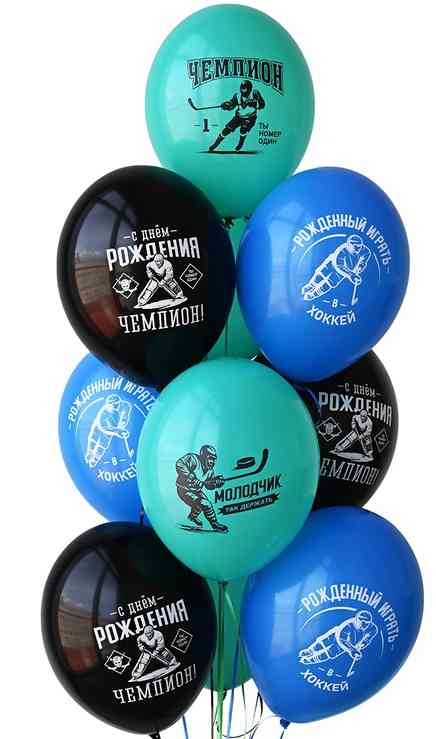 Высококачественный шар из натурального латекса. Пастель - матоввые шары, с двухсторонним шелкографическими текстовыми рисунками, с большим полем печати: С Днем Рождения Чемпион. Рожденный играть в хоккей. Только в перед. Ты неопбедимый. Молодчик - так держать. Чемпион - Ты номер 1.. Идеальный ассортимент для розничной продажи воздушных шариков и украшения праздника. Воздушные шары изготавливаются из экологически безопасного 100%-ного натурального латекса. В окружающей среде разлагаются на безопасные компоненты примерно с той-же скоростью, как обычные листья деревьев. После использования лопнуть и утилизировать как бытовой отход.