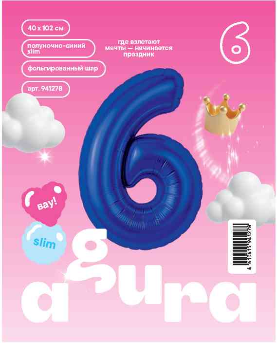 Шар фольга Цифра 40"AG Slim Полуночно-синий "6" (упак)