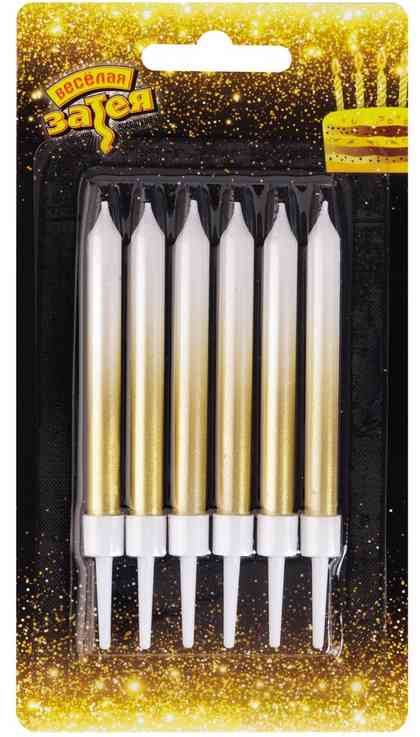 Декоративное украшение праздничного торта – перламутровые бело-золотые свечи с эффектом градиента. В упаковке 6 свечей с подставками, высота 8 см. Главное, успеть загадать желание, глядя на искрящийся каскад свечей.
