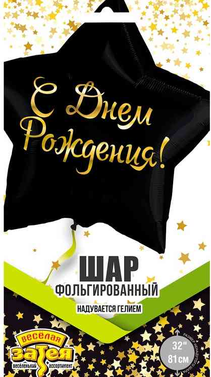 Фольгированный шар-звезда размером 32"/ 81см в ненадутом виде. Шар изготовлен из качественных материалов. Основной фон шара плотного, черного цвета с матовым эффектом, а надпись в дизайне - блестящего, металлизированного золотого цвета. Шар имеет встроенный клапан, что упрощает надувание. Для надува рекомендуется использовать гелий. Поставляется в красочной упаковке с цветным изображением шара, благодаря чему можно выставлять товар в ненадутом виде. Внимание! Реальный цвет товара может незначительно отличаться от представленного на фотографии в зависимости от настроек вашего монитора.