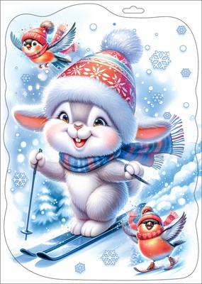 НГ Наклейка Зайчик и снегирь на лыжах А4