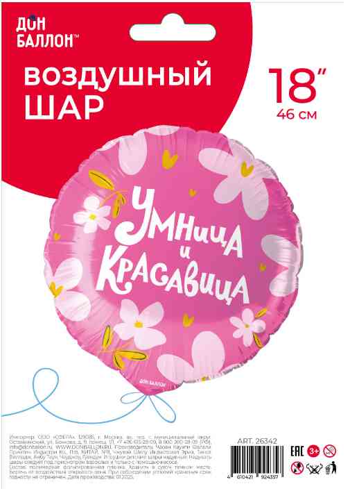 Шар фольга с рисунком 18"FL круг Умница и Красавица!