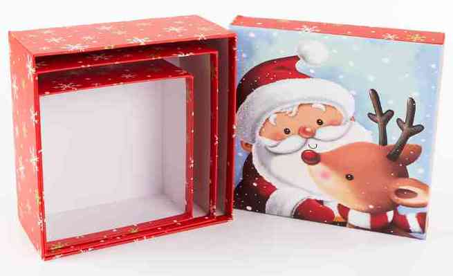 НГ Коробка квадрат 16х16х8см Дед Мороз и олененок Красный с блестками