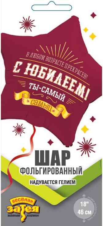 фольгированный шар размером 18"/ 46см в форме звезды с оригинальным дизайном к юбилею. Шар изготовлен из тонкой миларовой пленки (фольга на полиэтиленовой основе). Основной фон шара насыщенного, бордового цвета с матовым эффектом,а некоторые элементы в дизайне - блестящего, металлизированного золотого оттенка. Шар имеет встроенный клапан, что упрощает надувание. Для надува рекомендуется использовать гелий. Поставляется в красочной упаковке с цветным изображением шара, благодаря чему можно выставлять товар в сдутом виде. Внимание! Реальный цвет товара может незначительно отличаться от представленного на фотографии в зависимости от настроек вашего монитора.