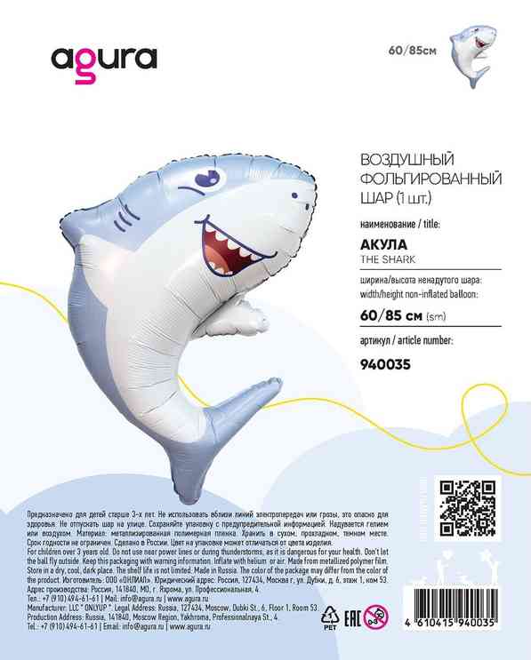 Воздушный фольгированный шар в форме Акулы. Смотрится красиво как самостоятельно, так и в качестве дополнения к фонтану из воздушных шаров для создания праздничного настроения. Шар поставляется в ненадутом состоянии. Для того, чтобы шар летал, рекомендуем надуть его гелием. Плотно надутый шар запаивать не требуется – шар снабжен клапаном, который хорошо удерживает гелий внутри шара. Надутый гелием шар летает от двух дней. Не забудьте привязать надутый гелием шар лентой к грузику, чтобы он не улетел (гелий, лента и грузик не входят в комплект, а приобретаются отдельно). Шар снабжён красочной упаковкой с изображением товара, что удобно для выкладки в торговом зале магазина. Внимание! Цветовой оттенок шара в действительности может отличаться от представленного на фотографии в зависимости от настроек Вашего монитора. Размер шара: в ненадутом виде – 60 х 85 см.