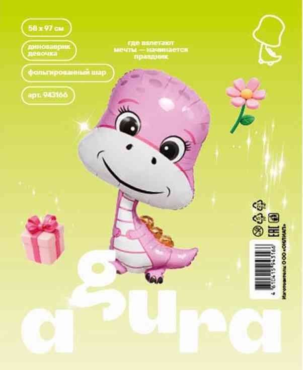 Воздушный фольгированный шар в форме милого Динозаврика. Смотрится красиво как самостоятельно, так и в качестве дополнения к фонтану из воздушных шаров для создания праздничного настроения. Шар поставляется в ненадутом состоянии. Для того, чтобы шар летал, рекомендуем надуть его гелием. Плотно надутый шар запаивать не требуется – шар снабжен клапаном, который хорошо удерживает гелий внутри шара. Надутый гелием шар летает от двух дней. Не забудьте привязать надутый гелием шар лентой к грузику, чтобы он не улетел (гелий, лента и грузик не входят в комплект, а приобретаются отдельно). Шар снабжён красочной упаковкой с изображением товара, что удобно для выкладки в торговом зале магазина. Внимание! Цветовой оттенок шара в действительности может отличаться от представленного на фотографии в зависимости от настроек Вашего монитора. Размер шара: в ненадутом виде – 58 х 97 см.